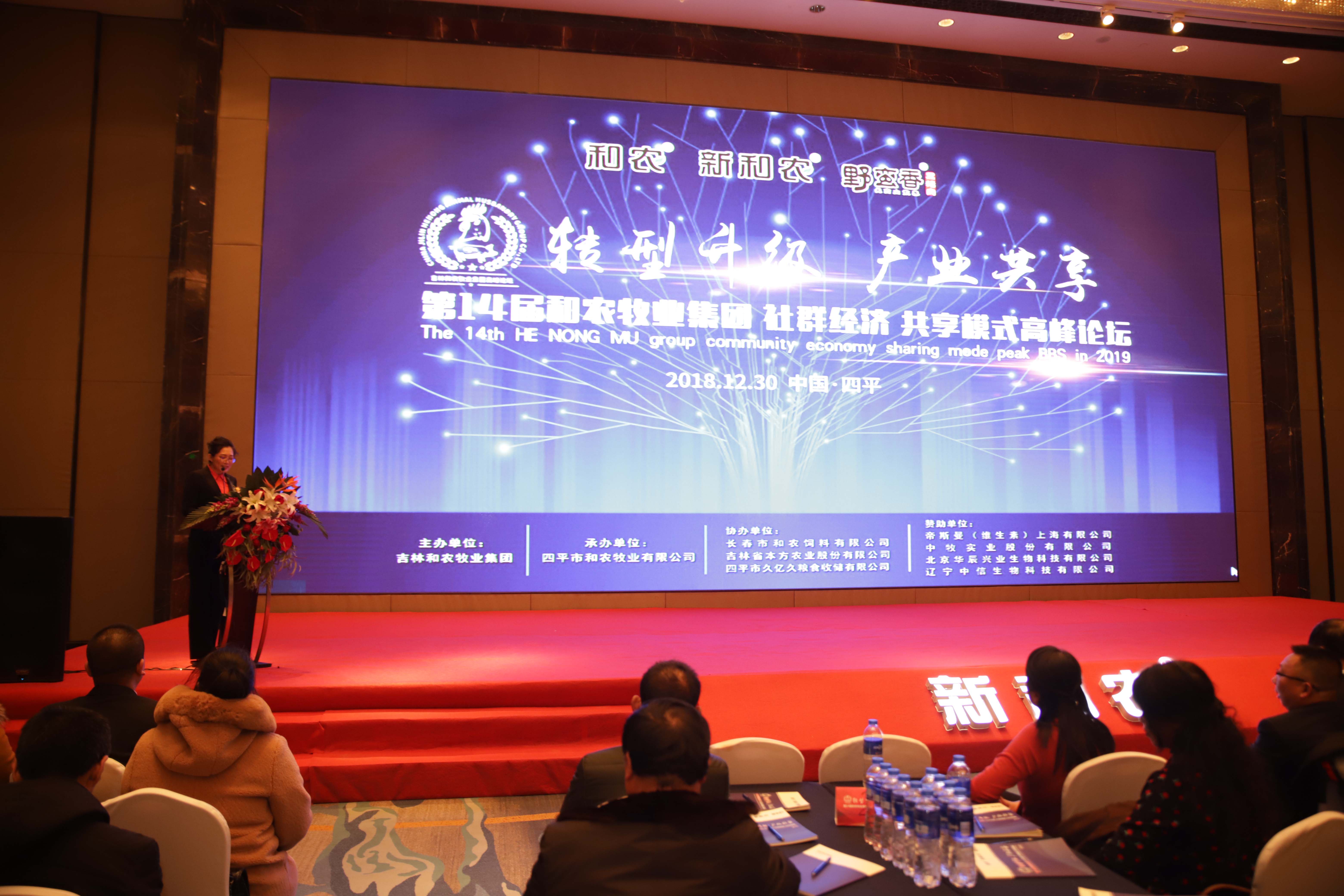 由吉林和農牧業(yè)集團主辦,四平和農牧業(yè)承辦,長春和農、本方農業(yè)、久億久糧食收儲協(xié)辦,帝斯曼、中牧實業(yè)、北京華辰興業(yè)生物、遼寧中信生物贊助支持的 "轉型升級 產業(yè)共享" —— 第十四屆和農牧業(yè)集團 社群經濟 共享模式 高峰論壇在四平萬達嘉華酒店隆重舉行。來自東北三省300余位企業(yè)優(yōu)秀代表參加了主題為“轉型升級 產業(yè)共享 社群經濟 共享模式”的高峰論壇。