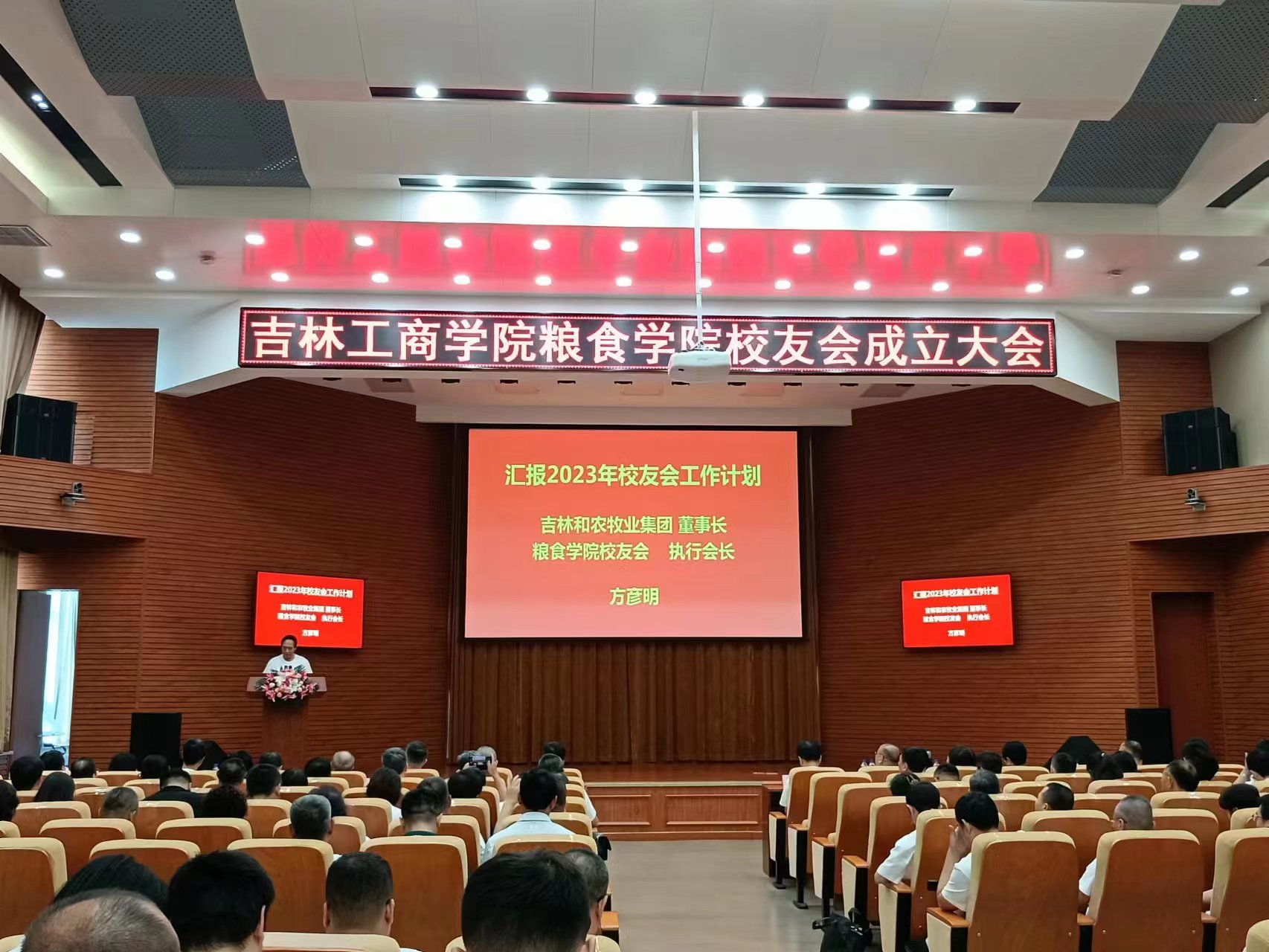 學(xué)校黨委副書記、校長張?jiān)浇?,黨委副書記杜希剛,副校長徐文出席大會。學(xué)校校友工作辦公室、各職能部門與教學(xué)單位主要負(fù)責(zé)人相關(guān)代表、糧食學(xué)院全體教職員工、來自全國各地的優(yōu)秀校友和在校學(xué)生代表共計(jì)180余人參加大會。吉林和農(nóng)牧業(yè)集團(tuán) 董事長方彥明先生當(dāng)選 吉林工商學(xué)院糧食學(xué)院第一屆校友理事會執(zhí)行會長。