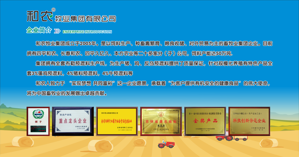 和農(nóng)牧業(yè)集團(tuán)成立于2005年,是以飼料生產(chǎn)、種畜禽繁育、糧食收儲(chǔ)、對外貿(mào)易為主的畜牧業(yè)集團(tuán)企業(yè)。飼料產(chǎn)能達(dá)50萬噸,集團(tuán)擁有全套布勒預(yù)混料生產(chǎn)線,為生產(chǎn)豬、雞、反芻預(yù)混料提供了質(zhì)量保證,針對規(guī)模化養(yǎng)殖有特色產(chǎn)品全套3%蛋雞預(yù)混料,4%豬料預(yù)混料,4%牛預(yù)混料等。